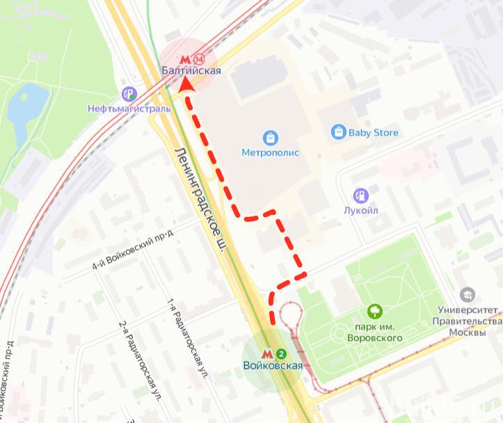 Переход не самый комфортный. По улице, почти 10 минут, но часть пути можно проложить через свежий ТЦ Метрополис